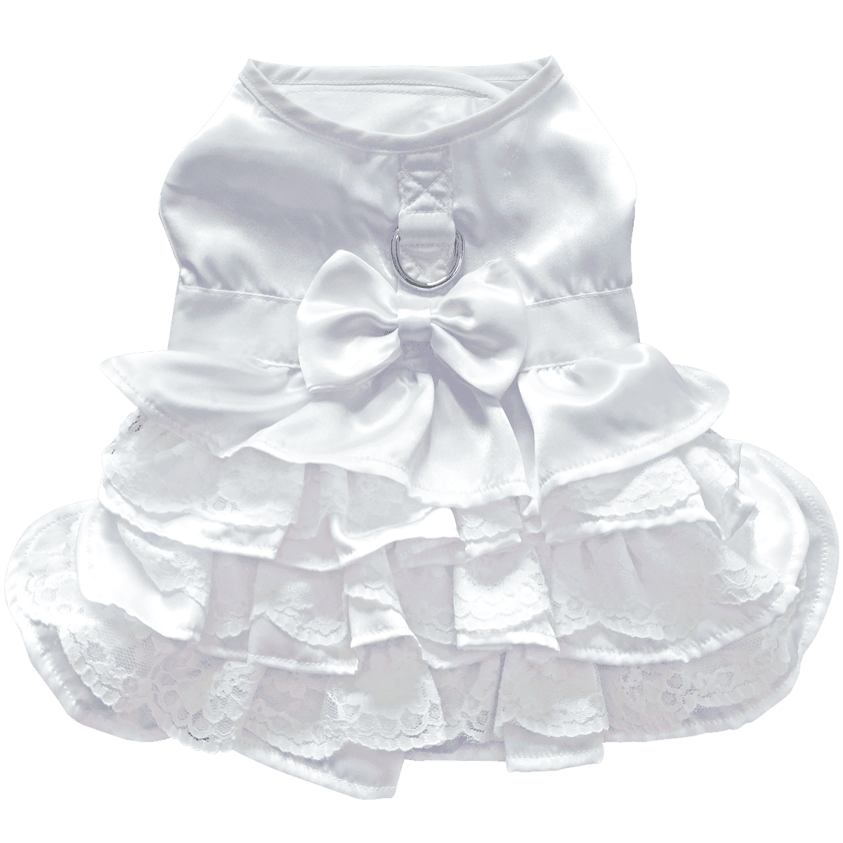 Your little bride will be so beautiful walking down the aisle wearing this elegant white satin and lace Dog Wedding Dress Set. The dress has three tiers of skirting, each with a layer of delicate white scalloped lace. The body of the dress is made from the highest quality white satin.