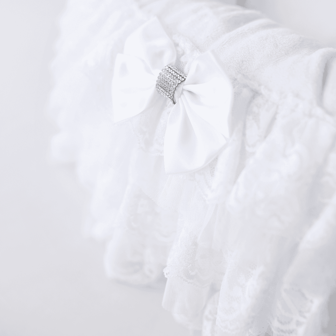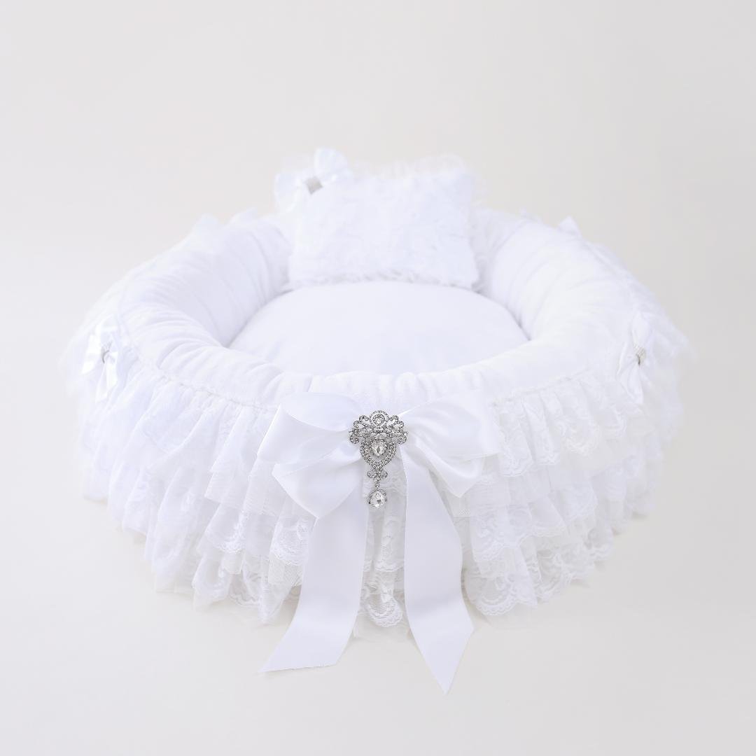 Introducing the Anastasia Dog Bed by Hello Doggie, the epitome of luxury and elegance for your beloved furry baby. Crafted from high-quality microsuede fabric and featuring exquisite two-tiered handmade romantic lace, this glamorous bed is truly fit for royalty. Adorned with our signature satin bows and a stunning brooch, it not only gives your baby a royal feeling but also adds a touch of sophistication to any room, making it a statement piece of elegant decor. Let your pet indulge in regal comfort while enhancing the aesthetic of your living space. For easy care, the pillow is removable and can we washed in cool water with no bleach or softener and air dry or tumble on low, spot clean the bed & lace. Dimensions Large -  23" x  8" (Inside Diameter 18")    |   For dogs up to 15 Lbs MSRP - $ 269.99 *Bed is handmade and sizes may vary slightly. Made in USA.
