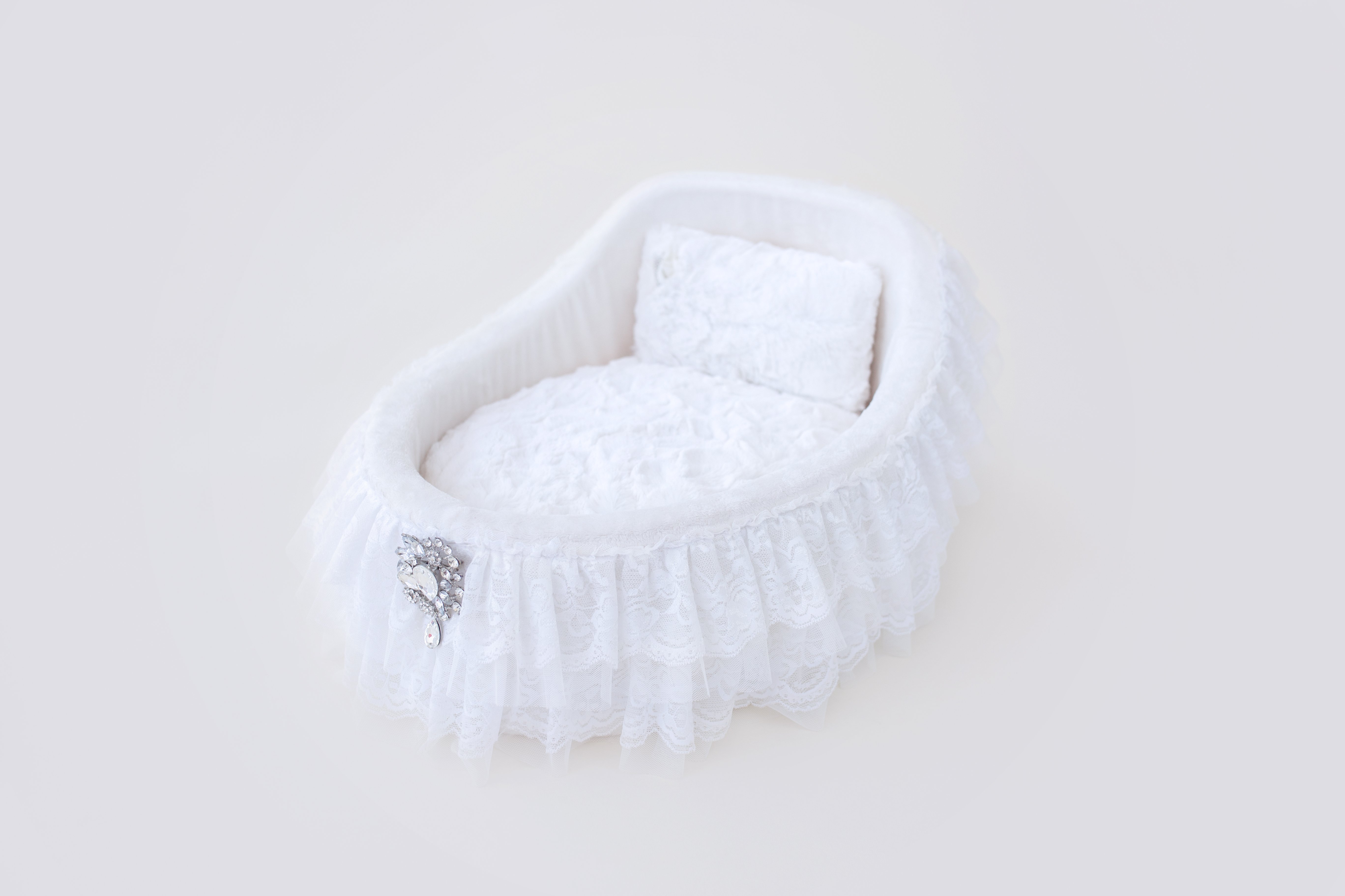 For that beautiful addition to your family, you'll want your pup to have sweet beginnings in our adorable Crib Bed by Hello Doggie, to lull your baby into sweet dreams. Trimmed in two-tiered romantic handmade lace, our cribs also feature a bouquet drop crystal brooch and removable pillow for easy care. Pair with any Hello Doggie Blanket. You'll be the envy of all your friends! Our collection offers four soft colors to choose from. One Size - *20" x 14" x 5 1/2"   |   Pillow inside - 18" x 12"   |   For dogs up to 6 Lbs MSRP - $177.99 *Bed is handmade and sizes may vary slightly. Made in USA.